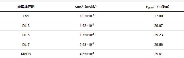 表2給出了混合磺酸鹽的臨界膠束濃度(cmc)和cmc時的表面張力(γcmc),可以看出,LAS展現(xiàn)出最佳的表面活性,隨著混合磺酸鹽中MADS含量的增加,cmc和γcmc呈增加趨勢,這是由于MADS分子中含有2個磺酸基團,親水性強,分子間靜電斥力大,不利于膠束的形成,且在氣/液排列時分子疏松,裸漏的-CH3密度小,即γcmc較高。