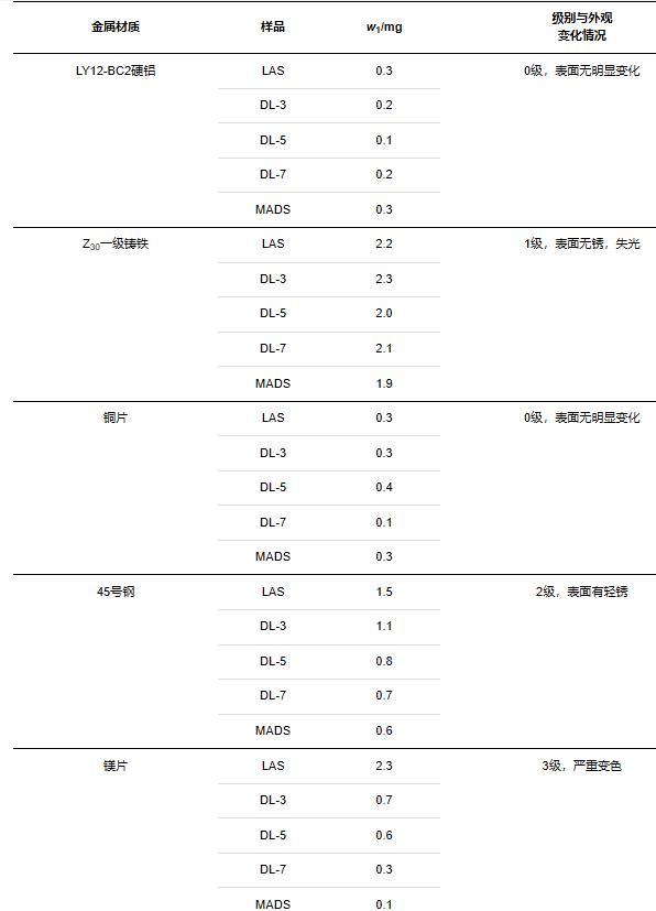 表面活性劑在使用過程中難免會接觸到金屬設備及容器,存在潛在的腐蝕問題[11]。本研究選用LY12-BC2硬鋁、Z30一級鑄鐵、銅片、45號鋼、鎂片這5種不同的金屬試片來模擬不同的金屬環(huán)境,對LAS、DL-n系列、MADS表面活性劑溶液進行金屬腐蝕性測試。通過觀察試片外觀變化以及腐蝕量計算來確定金屬腐蝕性級別。