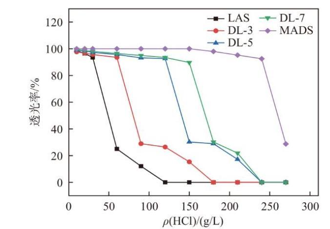 在許多工業(yè)過程中,表面活性劑會接觸到酸性環(huán)境,例如石油開采中的酸化處理、金屬表面處理、酸性清洗劑等[8-10]。研究表面活性劑的耐酸性可以確保這些產品在酸性條件下仍能保持穩(wěn)定性和功能性,從而避免在苛刻條件下失效或分解。磺酸基團為C-S鍵,與硫酸鹽類表面活性劑(如AES)相比,在酸性條件下較穩(wěn)定,不易分解。圖4給出了LAS、DL-n、MADS的耐酸性透光率圖,可以看出,隨著混合磺酸鹽中烷基二苯醚含量的增加,耐酸性逐漸增加。LAS耐酸性最差,MADS的耐酸性最好,在270 g/L時渾濁。混合磺酸鹽在結構上并沒有發(fā)生破壞,發(fā)生渾濁是由于聚集體形態(tài)發(fā)生了變化,從而體現(xiàn)出溶液渾濁的現(xiàn)象。