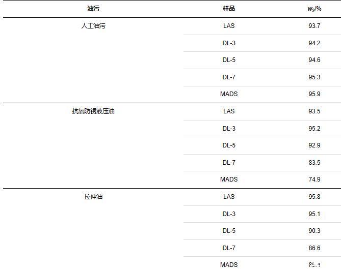 金屬凈洗力是指表面活性劑溶液在金屬表面去除污垢、油脂或其他污染物的能力,表面活性劑的金屬凈洗力直接影響其在工業(yè)清洗中的效果[12,13]。本研究選擇人工油污、抗氧防銹液壓油以及拉伸油模擬不同的工業(yè)場景,探究其對LAS、DL-n系列、MADS表面活性劑溶液凈洗力的影響。實驗結果如表4所示,可以看出:對于人工油污,隨著混合磺酸鹽中MADS含量的增多,凈洗力整體差異不大,都維持在90%以上;對于抗氧防銹液壓油與拉伸油,隨著混合磺酸鹽中MADS含量的增多,表面活性劑溶液親水性增加,對抗氧防銹液壓油、拉伸油乳化能力下降,凈洗力逐漸降低。