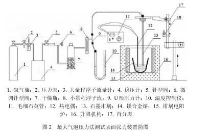 本研究采用“最大氣泡壓力法”測(cè)量阻燃鎂合金熔體的表面張力。實(shí)驗(yàn)裝置見(jiàn)圖如圖2所示。采用高純度氬氣作為工作氣體,干燥瓶中裝有CaCl2用于干燥氣體,毛細(xì)石英管直徑為2.86mm,端口經(jīng)過(guò)拋光、清洗處理,U形壓力計(jì)工作液體為純凈水。