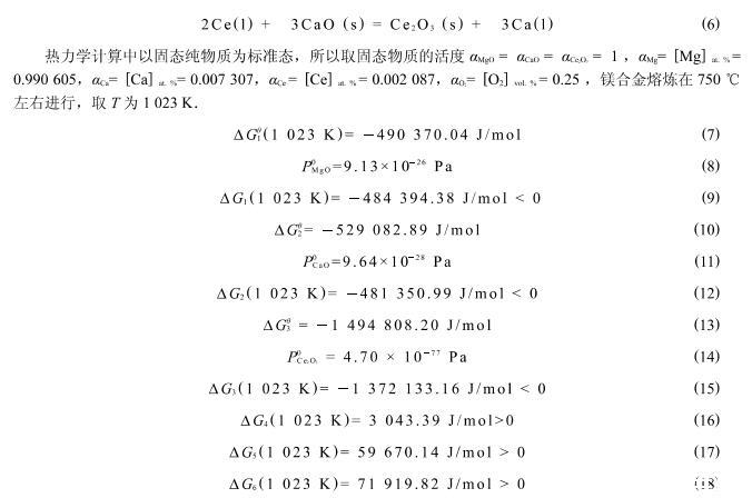 但由于Ce元素在合金熔體中是分布不均勻的,如圖6所示的點(diǎn)能譜分析可以看出,Ca和Ce在此處的相對(duì)原子分?jǐn)?shù)分別達(dá)到了2.50%和3.34%.按照此處的原子活度計(jì)算得到:Delta G_4(1023~K)=-12885.19~kJ/mol<0,Delta G_5(1023~K)=17418.58~kJ/mol>0,Delta G_6(1023~K)=56138.14~kJ/mol>0,在此處式(4)中的反應(yīng)可以自發(fā)地進(jìn)行.由此可知,式(4)、(5)、(6)的反應(yīng)在局部元素分布不均勻的區(qū)域有可能發(fā)生置換反應(yīng).