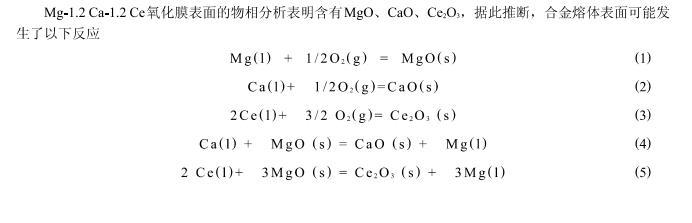 這種氧化膜結(jié)構(gòu)的明顯不同可以很好的解釋阻燃效果之間的差異.歸其原因,主要是由于,在沒有添加任何Ce元素的情況下,不論形成的MgO薄膜還是CaO薄膜,由于其致密度較低,因此不能夠完全阻止氧的進(jìn)一步擴(kuò)散;相反,在添加了較多元素的Ce后,不但可以形成更加致密的復(fù)合的氧化膜,而且Ce2O3比較致密,不但可以很好的隔絕氧的進(jìn)一步擴(kuò)散,而且還能夠添補(bǔ)許多裂紋,因此,具有很好的阻燃效果.