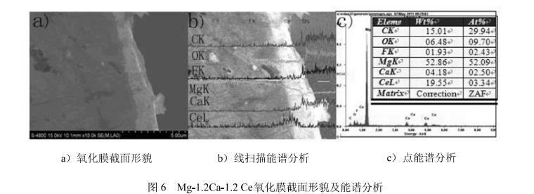 圖6為Mg-1.2Ca-1.2Ce氧化膜截面的形貌和元素分布線掃描分析.從圖中可以看出,氧化膜的厚度差不多有2μm,Ca元素主要分布在氧化膜的中間部分,而Ce元素主要分布在氧化膜與鎂基體的交界處.根據(jù)先掃描結(jié)果可以將Mg-1.2Ca-1.2Ce氧化膜結(jié)構(gòu)分為三層,最外面主要為MgO,中間層主要為CaO,最內(nèi)層主要為Ce2O3.