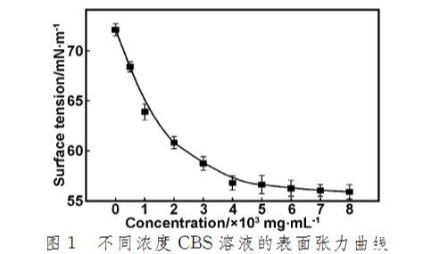 將CBS溶解于蒸餾水中制備4 mg/mL的母液,并稀釋至一系列濃度((0~8.0)×10^-3 mg/mL)的樣品作為測試液,采用OCAH200表面張力儀測定不同濃度CBS溶液的表面張力,測試溫度為20℃。