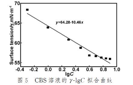 通過γ-lg C曲線,應(yīng)用Gibbs吸附(式(1))可求出不同濃度下CBS溶液的表面吸附量。當(dāng)CBS的表面張力與其濃度對數(shù)呈線性關(guān)系時,由直線的斜率即可求出飽和吸附量(rm)。圖5即為CBS溶液在20℃時的γ-lg C線性擬合。