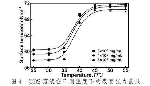 (3)CBS溶液的表面張力隨溫度的升高呈現(xiàn)兩種狀態(tài)。在低溫下,保持較好的表面活性,當(dāng)溫度升高到一定程度(>35℃),由于變性作用,使得CBS的表面張力急劇增大。