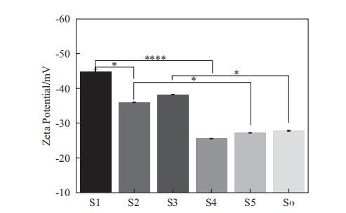 在我們的研究中,測(cè)量了Zeta電位,如圖6所示。對(duì)于SLES體系(S1-S3),S1表現(xiàn)出最負(fù)的Zeta電位,其次是S3,而S2的Zeta電位最小。對(duì)于SMCT體系(S4-S6),它們之間的Zeta電位沒(méi)有顯著差異。比較SLES和SMCT體系時(shí),可以觀察到SMCT體系的Zeta電位低于SLES體系。此外,在S1和S4、S2和S5以及S3和S6之間發(fā)現(xiàn)了顯著差異。