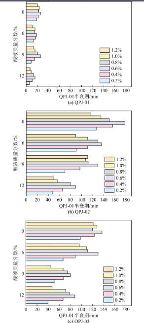 為了研究3種不同濃度起泡劑復(fù)配不同濃度酸溶液的泡沫穩(wěn)定性能,根據(jù)泡沫持續(xù)時(shí)間(半衰期)評(píng)價(jià)泡沫體系的穩(wěn)定性,如圖8所示。由圖8可知,不同起泡劑復(fù)配體系的半衰期存在顯著差異,其中QPJ-01復(fù)配溶液的泡沫半衰期明顯低于其余2種,QPJ-02泡沫半衰期更長,泡沫體系穩(wěn)定性更好。同時(shí),酸液濃度對(duì)泡沫穩(wěn)定性起抑制作用,酸液濃度越高,泡沫衰減速度更快,清水復(fù)配3種起泡劑溶液泡沫半衰期均更長。