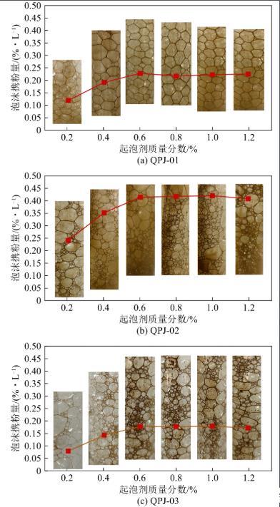 在臨界濃度范圍內(nèi)的QPJ-03濃度越高,小氣泡數(shù)量逐漸增長,泡沫趨于綿密,因此,起泡劑質(zhì)量分?jǐn)?shù)小于0.6%攜粉量逐漸增長。QPJ-03泡沫整體均勻性較差,泡徑差別較大,這是導(dǎo)致QPJ-03泡沫穩(wěn)定性較差、半衰期較短的原因,也是造成QPJ-03單位體積泡沫攜粉量較少的原因。QPJ-01與QPJ-03隨濃度增長,氣泡間液膜厚度增長較為明顯。因此結(jié)合半衰期,泡沫直徑大較泡沫直徑大小不均對(duì)泡沫穩(wěn)定性影響更為嚴(yán)重。
