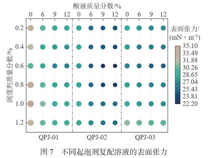 氣液界面表面張力一定程度上表征起泡性能,溶液氣液表面張力越小,分子間束縛力下降,氣泡更容易溢出,起泡性能更強(qiáng)。因此為了測(cè)定混合酸環(huán)境下不同起泡劑復(fù)配溶液起泡效果,選用設(shè)備為SDC-350整體傾斜型接觸角測(cè)量儀開展表面張力測(cè)試試驗(yàn)。圖7為QPJ-01、QPJ-02、QPJ-03等3種不同濃度起泡劑在清水與不同濃度酸液條件下的氣液界面表面張力,由圖7可知,3種起泡劑?酸液復(fù)配溶液表面張力與起泡劑?清水溶液相比,均呈降低狀態(tài),溶液含酸較清水會(huì)顯著降低氣液界面表面張力,含酸率越高,表面張力越小,在一定程度上溶液酸度對(duì)起泡性能起促進(jìn)作用。在相同起泡劑復(fù)配酸液溶液內(nèi),酸液濃度越大,氣液界面表面張力減少越緩慢,酸液越稀,表面張力下降越快。