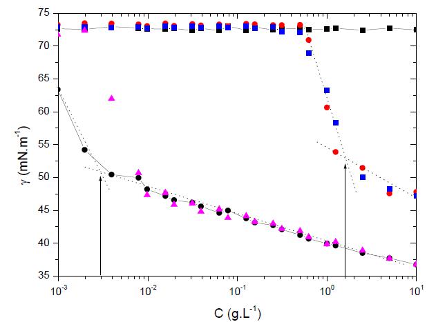 微流控技術是一種利用微米尺度管道及其它輔助手段對納升、皮升級流體單元進行主、被動操縱的新興技術。近年來,Karakasyan研究團隊應用微液滴微流控技術制備出單分散響應型的聚醚胺-海藻酸鹽共聚的微凝膠(Colloids and Surfaces B:Biointerfaces,2015,135,619–629),聚醚胺(PEA)與環(huán)氧丙烷/環(huán)氧乙烷(29/6)通過兩種分子之間的胺鍵相連接枝共聚得到海藻酸鹽接枝型的微凝膠。液滴微流控技術為海藻酸鹽接枝微凝膠提供了精準的尺寸和物理化學性質控制,使得這些微凝膠與單獨的海藻酸接枝鏈比,仍然保持有兩親型和熱敏性等性質,應用表面張力測試技術研究微凝膠的表面化學性質,通過使用Delta-8高通量表面張力分析儀,采用Du Nouy-Padday法(最大拉力法)測試了不同濃度比例的組成聚醚胺-海藻酸鹽共聚物化合物的表面張力,并自動將表面張力記錄到系統(tǒng)中,由于Delta-8高通量表面張力儀能夠一次性測試96個樣品,軟件對測試的樣品的數(shù)據(jù)能夠進行自動分析,從而獲得了聚醚胺-海藻酸鹽共聚物的臨界聚集濃度(CAC)以及臨界膠束濃度(CMC)。(如下圖1所示)。