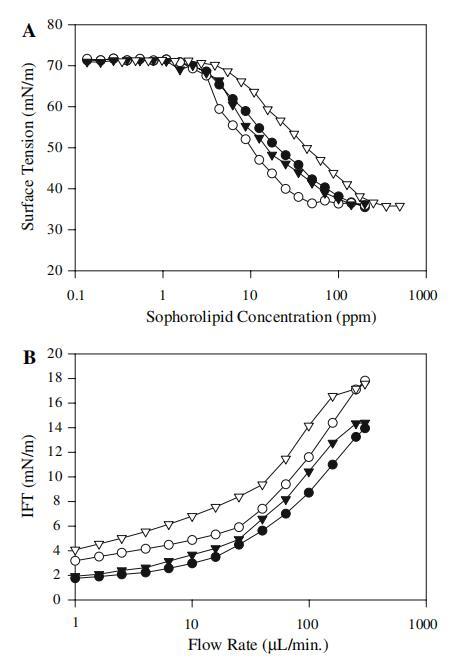 槐脂(SLs)相對較大的生產(chǎn)能力、可再生性和“生態(tài)友好性”有助于提高其作為家庭和個人護理產(chǎn)品中某些石化表面活性劑的添加劑或替代品的工業(yè)意義。 然而,為了考慮用于工業(yè)用途,SLs也必須廉價生產(chǎn),并且必須了解和控制其物理性質(zhì),以便準確預(yù)測SLs在各種應(yīng)用中的潛力。 表面張力(ST)、臨界膠束濃度(CMC)、界面張力(IFT)和水溶性是表面活性劑應(yīng)用特別關(guān)注的四個性質(zhì)。 理想情況下,良好的表面活性劑是水溶性的,表現(xiàn)出較低的CMC,并導(dǎo)致最小表面張力(min.ST)小于30 mN/m。 這些性質(zhì)中的每一種都可以根據(jù)表面活性劑的化學(xué)組成進行控制。 通過在多種不同的混合基質(zhì)(包括葡萄糖和4種不同的脂肪酸)上生長棉鈴蟲,我們產(chǎn)生了具有不同化學(xué)分布的SLs。 簡單地通過改變脂肪酸來生產(chǎn)不同的SLs的能力提供了在發(fā)酵水平上管理物理性質(zhì)的前景,并通過在應(yīng)用水平上以不同的比例混合SLs。