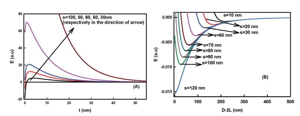 圖6足跡直徑對粘粒組件的影響。(A) 作為界面區(qū)域厚度函數(shù)的能量變化(L?60 nm,T?298 K,f?0.5,姜黃素納米顆粒半徑R?50 nm,疏水衰減長度x0?1 nm,界面張力?40 mN m-1)。(B) 粘粒–粘粒相互作用作為粒間分離D的函數(shù),使用方程(5)計(jì)算。對于更大的封裝外形直徑,能量最小值變得更深,對于大于100 nm的s,能量最小值變得更有吸引力。