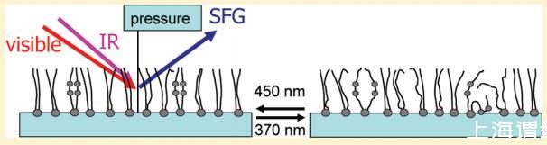 在此,我們研究了光開關脂質DT Azo-5P(圖1)的單層,其為純的,并與脂質1,2-二棕櫚酰-sn-甘油-3-磷酸膽堿(DPPC)混合。如圖1中的UV/vis光譜所示,光活性脂質可分別用370和450 nm的光從其反式狀態(tài)切換到順式狀態(tài)并返回。我們將表面壓力測量與無標簽、寬帶振動和頻率產(chǎn)生(VSFG)光譜相結合。10這些技術使我們能夠研究空氣-水界面上的脂質分子單層。可以獲得有關脂質與水分子相互作用的信息以及脂質的分子結構。在非線性光學技術VSFG中,紅外(IR)光束和可見光(VIS)光束在界面處組合,產(chǎn)生具有兩個入射光束和頻率的信號。如果紅外線與分子振動共振,信號就會強烈增強。已經(jīng)證明,這種通過分子振動的技術提供了有關脂質分子構象和取向的信息。11-18在中心對稱介質中禁止和頻產(chǎn)生,因為這是一種二階非線性光學過程。19因此,該技術對中心對稱材料(如水表面)的最外表面分子層敏感。相反,缺少信號表明界面上的材料或分子群是中心對稱的。對于金表面偶氮苯功能化自組裝單分子膜,SFG在測定光異構化的截面和機理方面非常有用。得出的結論是,光異構化是由直接電子激發(fā)驅動的,類似于液相中的偶氮苯
