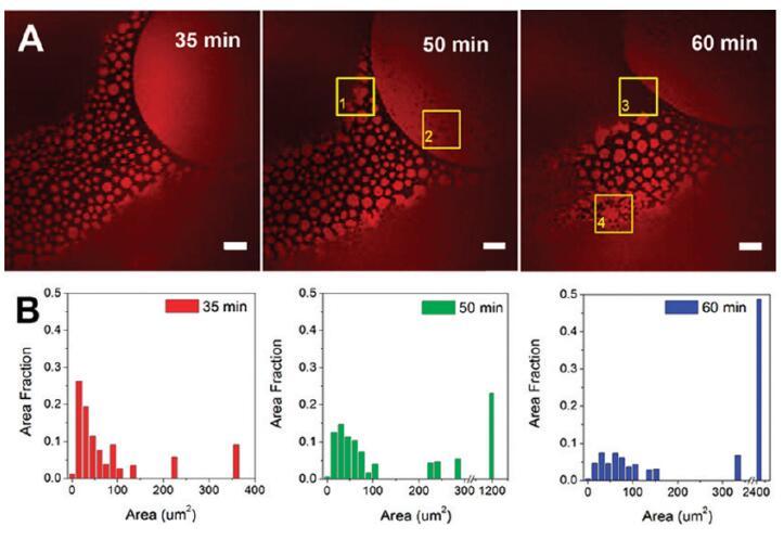 圖5。蛋白質(zhì)島隨時(shí)間的聚合。(A)導(dǎo)入后35、50和60分鐘拍攝的共焦熒光圖像。比例尺:20μm.(B)蛋白質(zhì)島大小分布的直方圖。初始亞期濃度為[HSA-TR]=0.50 mg/mL和[F-127]=0.015 mg/mL。ROI-1表示一個(gè)區(qū)域(黃色框),其中小的蛋白質(zhì)島與周圍的蛋白質(zhì)島結(jié)合形成一個(gè)較大的島;ROI-2表明該區(qū)域形成了小黑洞;ROI-3表示在表面活性劑富集區(qū)域的邊界處的運(yùn)動(dòng);ROI-4顯示了小的蛋白質(zhì)島合并成網(wǎng)狀網(wǎng)絡(luò)的地方。