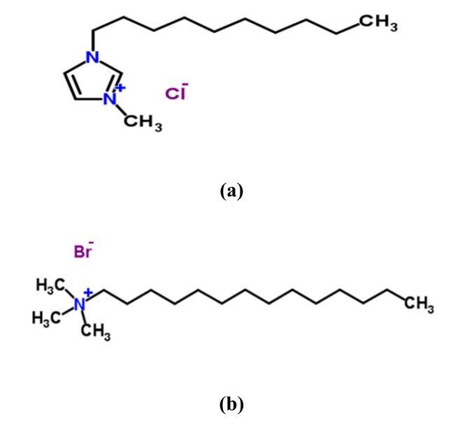 因此,牢記混合表面活性劑的上述優(yōu)點(diǎn),已嘗試研究陽離子表面活性劑與表面活性離子液體在純水中以及在二甘醇(DEG)-水二元混合物存在下的混合膠束化,為了進(jìn)一步了解二甘醇對這些混合體系的影響。所使用的離子液體為1-癸基-3-甲基咪唑氯化物[C10min][Cl],陽離子表面活性劑為十六烷基三胺(CET),陰離子染料為甲酚紅(CR)(方案1)。ILs在兩相均相催化過程中也有廣泛的應(yīng)用,在這些催化過程中,含有催化劑的一相與含有反應(yīng)物和產(chǎn)物的第二相完全不混溶。正如我們所知,二甘醇是一種有機(jī)溶劑,因此大多數(shù)催化反應(yīng)被認(rèn)為發(fā)生在離子液體和有機(jī)溶劑的界面[26]。
