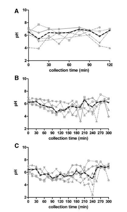 圖1。五名健康受試者在禁食(A)、喂食(B)和富含脂肪的喂食(C)狀態(tài)HIF中的個人和中值pH值隨時間的變化。(--?--)主題1(··?··)主題2,(·–·)△·–·)主題3,(·-·▽·–·)主題4,(-◇–)受試者5,(――中位)。
