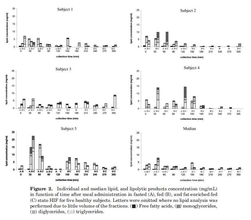 因此,根據(jù)這些數(shù)據(jù),TG和DG、MG或FFA之間沒有相關(guān)性。受試者的總脂質(zhì)濃度差異很大。與受試者4和5相比,受試者1、2和3在喂食條件下的十二指腸總脂濃度通常較低。Hernell等人也描述了從Treitz角度取樣的十二指腸脂質(zhì)含量的顯著受試者間差異。27除了明顯的受試者間差異外,個體濃度也隨時間波動。受試者體內(nèi)的這種變異可能由多種因素解釋,包括胃排空的變化、胃腸道的擴散、同時進行的消化和吸收以及腸道內(nèi)容物的不均勻分布。利用磁共振成像(MRI),Weitschies及其同事最近證實了腸道內(nèi)液體的不均勻分布;28腸液被稱為在水囊中分離;此外,研究還表明,進食后小腸液體總量顯著減少。胰脂肪酶在油水界面發(fā)揮作用;因此,脂肪分解消化產(chǎn)物預(yù)計將在這些水袋的直接環(huán)境中釋放。由于水分室不連續(xù)分布,脂肪分解產(chǎn)物在小腸中也不均勻分布。這可以解釋剖面中觀察到的可變性。然而,在五名受試者中,隨著時間的推移計算出的總脂質(zhì)濃度中值顯示,在給藥30分鐘后濃度降低,在給藥120分鐘后達(dá)到穩(wěn)定狀態(tài)(圖2)。由于個別pro文件有時與此中間配置文件存在很大差異,因此平均配置文件的有用性可能會受到質(zhì)疑。29,30然而,這一中位數(shù)曲線確實與先前的研究一致,在之前的研究中,攝入食物后約1小時,脂質(zhì)濃度處于穩(wěn)定狀態(tài),持續(xù)3小時。11,12,31穩(wěn)態(tài)期間描述了恒定的TG濃度,而FFA濃度增加或恒定。在之前的每一項研究中,F(xiàn)FA水平在每個測量點都高于鎂水平;計算得出該比率約為3-6。相反,目前的數(shù)據(jù)集指出,在整個收集期內(nèi),鎂是主要成分,其次是FFA。TG的含量通常非常少或無法檢測到。這可能意味著膳食TG的快速水解,從胃脂肪酶開始。其他人也提出了類似的意見。11,31當(dāng)將這些數(shù)據(jù)與以前提出的腸道脂質(zhì)濃度進行比較時,應(yīng)注意到以前的濃度始終以摩爾水平表示,而在本研究中,結(jié)果以w/v濃度單位表示。因此,MG/FFA的比率在以重量為基礎(chǔ)表示時將以犧牲游離脂肪酸為代價進行移動,當(dāng)然對于由長鏈脂肪酸組成的脂質(zhì)材料而言。
