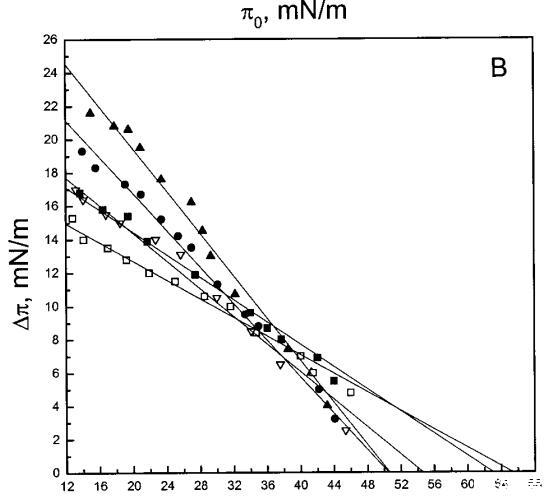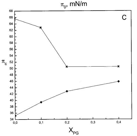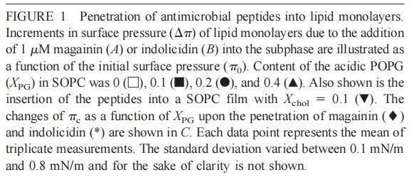 通過測(cè)量表面壓力的增量,觀察到抗菌肽在不同初始表面壓力(π0)下嵌入到空氣/水界面上的脂質(zhì)單層中(?π)將肽添加到亞相后(Brockman,1999;Verger和Pattus,1976)。Magainin 2在π0>12 mN/m時(shí)容易插入SOPC單層(圖1A),而在π0以上≈35 mN/m時(shí),其在膜中的滲透被消除,因此該值表示該肽與SOPC膜相互作用的臨界包裝壓力πc。根據(jù)其凈正電荷4(Matsuzaki,1998),當(dāng)膜中酸性磷脂POPG的含量增加時(shí),magainin 2向脂質(zhì)單層的滲透逐漸增強(qiáng)(圖1 A)。因此,消除magainin 2插入單層的πc值增加至~39(XPG=0.1)、43(XPG=0.2)和46 mN/m(XPG=0.4)(圖1c)。相反,在SOPC膜中加入膽固醇(Xchol=0.1)對(duì)magainin 2的滲透沒有顯著影響(圖1A)。