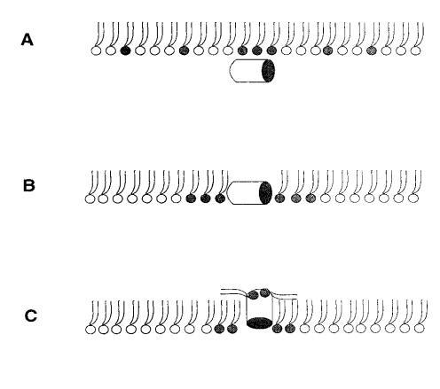 對(duì)于測(cè)試的所有單層組成,吲哚青霉素的πc值超過了馬蓋寧2的測(cè)量值(圖1 c),表明該肽在酰基鏈之間有效插入和插層。吲哚西丁在~38 mN/m的交叉點(diǎn)值得關(guān)注。在后一個(gè)表面壓力之下,表面壓力的增量??在PG存在的情況下,吲哚西丁引起的反應(yīng)增強(qiáng),而在較高的初始脂質(zhì)堆積密度下觀察到相反的反應(yīng)。有趣的是,不管脂質(zhì)成分(即PG的存在)如何,交叉點(diǎn)幾乎保持不變,因此表明它可以完全由表面壓力決定,而不管靜電相互作用如何。一種可能的機(jī)制是,在π0>38 mN/m時(shí),吲哚西丁以壓力依賴的方式改變其在單層中的取向,可能是從其長軸相對(duì)于層平面的平行到垂直取向(圖9,B和C),從而減少面積/肽并減少?π.此外,一些靜電結(jié)合吲哚肽的PG分子也可能與單層中的磷脂方向不同。換句話說,吲哚西丁與其相關(guān)的PG將形成一種超分子復(fù)合物,其取向?qū)⑷Q于壓力。這在圖9中示意性地示出。重要的是,所提出的肽連接磷脂的重新定向?qū)⑴c最近提出的模型兼容,在該模型中,穿過雙層的孔表面的一部分將由脂質(zhì)頭基構(gòu)成(Ludtke et al.,1996)。