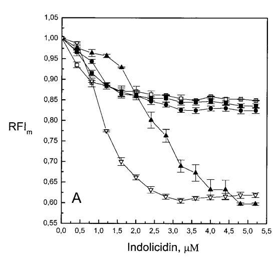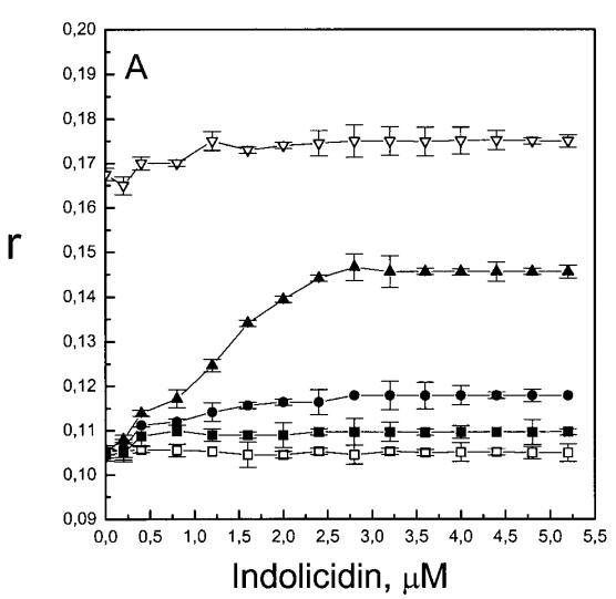 與magainin 2類似,吲哚青霉素與陰離子和兩性離子囊泡的膜結(jié)合非常不同(圖1b、4和5),與先前的平衡透析研究一致(Ladokhin et al.,1997)。雖然芘熒光的猝滅顯示吲哚肽被分配到SOPC雙層中,但對(duì)膜酰基鏈順序幾乎沒有影響(圖5)。相反,吲哚西啶與陰離子膜的相互作用導(dǎo)致脂酰鏈順序增加,明顯表現(xiàn)為DPH熒光各向異性增加,并對(duì)XPG呈S形依賴(圖5)。與magainin 2相反,吲哚西丁導(dǎo)致芘單體和準(zhǔn)分子發(fā)射強(qiáng)度顯著平行降低,與脂質(zhì)成分無關(guān),Ie/Im變化較小(圖4)。相應(yīng)地,吲哚西丁誘導(dǎo)酸性PG富集到微區(qū)。有趣的是,在吲哚西丁/脂質(zhì)摩爾比為1:20以下,芘Im的減少順序?yàn)閄PG=0.40.20.10(圖4a),而在吲哚西丁/脂質(zhì)摩爾比為1:10時(shí),Im的減少對(duì)XPG的依賴性相反。這種變化的可能機(jī)制如下。在低肽/脂摩爾比時(shí),吲哚西丁似乎被調(diào)節(jié)到雙層界面(Ladokhin等人,1997),芘標(biāo)記鏈的鏈反轉(zhuǎn)(Holopainen等人,1999)使該部分更接近雙層表面,從而允許其與吲哚西丁的基本殘基接觸。后者通過π-陽離子相互作用導(dǎo)致芘部分的碰撞猝滅。然而,隨著XPG的增加,我們可以預(yù)期PG頭基與吲哚西丁的堿性殘基發(fā)生靜電結(jié)合,從而阻止芘與吲哚西丁的陽離子殘基之間的直接接觸。隨著肽濃度的增加,吲哚肽的膜結(jié)合以協(xié)同方式增強(qiáng),猝滅效率的逆轉(zhuǎn)可能涉及雙分子層中脂肽復(fù)合物的聚集。因此,在酸性含磷脂的膜中,吲哚對(duì)芘的猝滅作用較小。當(dāng)吲哚肽的濃度增加到肽/脂比1:10以上時(shí),肽將以高度協(xié)同的方式并入膜的酰基鏈區(qū)域(Ha等人,2000)(圖9 E),而在中性膜中,肽位于界面(圖9 D)。插入吲哚西丁的量取決于雙層中的XPG,導(dǎo)致吲哚西丁的Trp殘基的猝滅占主導(dǎo)地位,與XPG=0.4時(shí)Im的顯著減少一致(圖4a)。