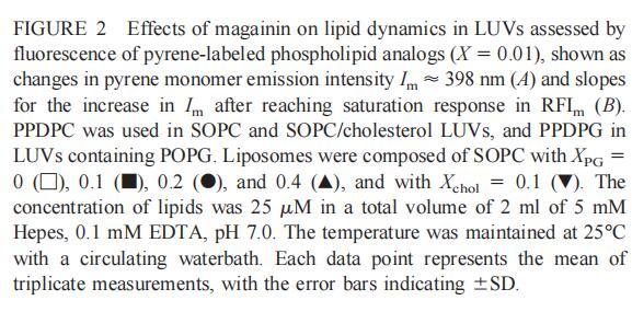 繼上述單層研究之后,有興趣探索肽對(duì)脂質(zhì)動(dòng)力學(xué)的影響。這是通過使用熒光光譜和不同脂質(zhì)成分的LUV完成的,記錄芘標(biāo)記的熒光磷脂類似物PPDPC或PPDPG的發(fā)射光譜(均為X=0.01)。對(duì)于SOPC LUV,添加magainin 2導(dǎo)致芘熒光顯著猝滅,芘單體和準(zhǔn)分子發(fā)射強(qiáng)度平行降低,如Im所示(圖2)。作為XPG的一項(xiàng)功能,還研究了馬蓋寧2與脂質(zhì)體結(jié)合的后果。當(dāng)XPG從0.1增加到0.4時(shí),觀察到由于magainin 2在398 nm處逐漸增強(qiáng)的Im(RFIm),而Im的初始增量在明確定義的PG/magainin 2化學(xué)計(jì)量比~2、3和5時(shí)趨于平穩(wěn)(圖2 A)。在這個(gè)初始階段之后,直到給定的化學(xué)計(jì)量比,還有第二個(gè)過程,其斜率也隨著XPG的增加而增加(圖2b)。在XPG=0和0.1時(shí),Magainin 2僅引起Ie/Im的輕微變化,而在XPG=0.2和0.4時(shí),分別減少10%和25%是明顯的(圖3 A)。為了區(qū)分脂質(zhì)動(dòng)力學(xué)中兩種性質(zhì)不同的變化,即側(cè)向遷移率和微結(jié)構(gòu)域形成,作為上述Ie/Im變化的根本原因,我們還通過測(cè)量DPH的熒光各向異性r來評(píng)估酰基鏈順序的變化(圖3 B)。在缺乏酸性磷脂的情況下,Magainin 2幾乎不會(huì)引起r的變化(圖3B)。然而,隨著XPG的增加,加入magainin 2后脂質(zhì)堆積和酰基鏈順序逐漸增加(圖3b),XPG=0.4時(shí),r最大增加1.4倍。值得注意的是,XPG=0.1時(shí)Ie/Im沒有變化以及酰基鏈順序的增加表明PPDPG正在發(fā)生微觀富集。有趣的是,在存在膽固醇(Xchol=0.1)的情況下,由于馬蓋寧2的作用,Im和Ie都顯著降低,Ie/Im的變化不顯著(圖2A和3A)。如前所述(van Ginkel et al.,1989),添加肽前r的增加(圖3 B)揭示了通過在膜中摻入膽固醇而增強(qiáng)的膜順序。然而,在膽固醇存在的情況下,magainin 2對(duì)r沒有進(jìn)一步的影響(Xchol=0.1,圖3b)。