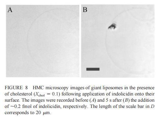 隨后,我們研究了吲哚西丁對(duì)由SOPC和膽固醇組成的巨大脂質(zhì)體(Xchol?0.1)的影響。吲哚西丁在膽固醇存在的情況下也會(huì)引起巨大脂質(zhì)體的起泡。形成的內(nèi)吞小泡在巨大小泡的表面上深度聚集(圖8b)。具體地說,在添加約0.2 fmol吲哚西啶(~400 fl,20次注射,圖8 B)后約5 s內(nèi),巨大脂質(zhì)體表面出現(xiàn)一簇小顆粒。隨后,聚集物轉(zhuǎn)移到巨大的脂質(zhì)體中,同時(shí)也有少量內(nèi)吞顆粒(θ≈0.9米)處可見。進(jìn)一步添加吲哚西丁會(huì)增加這些顆粒的數(shù)量,并導(dǎo)致巨大脂質(zhì)體收縮。然而,即使在暴露于~2 fmol吲哚西丁(200次注射,數(shù)據(jù)未顯示)的情況下,膜大體上仍保持完整。
