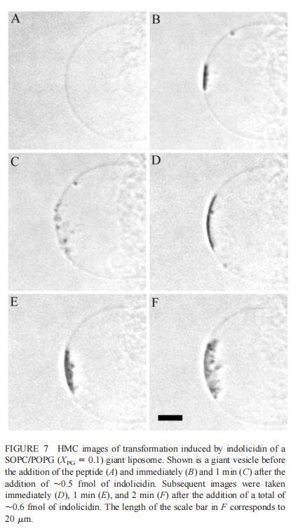由于上述magainin 2和吲哚西啶對(duì)單層和LUV具有明顯的脂質(zhì)成分依賴性作用,因此有興趣使用巨型脂質(zhì)體比較這些肽對(duì)宏觀膜的三維拓?fù)浣Y(jié)構(gòu)的影響,無論是否含有PG,都可以在交流電場(chǎng)中形成由SOPC組成的巨大脂質(zhì)體。即使暴露于大量肽(~2 fmol,~4 pl=200次重復(fù)注射,數(shù)據(jù)未顯示),SOPC膜也不受magainin 2的影響。同樣,由SOPC和膽固醇(Xchol=0.1)組成的巨大脂質(zhì)體也不受此量的馬蓋寧2的影響(數(shù)據(jù)未顯示)。然而,在存在POPG(XPG=0.1)的情況下,已經(jīng)~0.01 fmol(單次~20 fl注射)的magainin 2應(yīng)用于巨大囊泡表面,顯著影響巨大脂質(zhì)體膜的拓?fù)浣Y(jié)構(gòu)(圖6 B)。更具體地說,在~1分鐘內(nèi),小顆粒(θ≈0.9米)出現(xiàn)在巨大的囊泡內(nèi)。隨后注射高達(dá)~0.1 fmol(約200 fl)的magainin 2不會(huì)引起進(jìn)一步的可見變化。在總共添加約0.2 fmol的肽后,膜開始起伏,形成致密顆粒(θ≈4 m)在巨大脂質(zhì)體內(nèi)可見(圖6 C)。在~5分鐘內(nèi),幾個(gè)小顆粒(θ≈0.9 m)出現(xiàn)在巨大脂質(zhì)體膜的內(nèi)表面(圖6 D)。隨后,大多數(shù)小顆粒進(jìn)入巨大囊泡的內(nèi)腔。這些內(nèi)吞小泡似乎在巨大脂質(zhì)體內(nèi)自由移動(dòng),在隨后30分鐘的觀察中沒有進(jìn)一步的變化。進(jìn)一步注射magainin 2,提供總共0.3 fmol的肽,引起類似內(nèi)吞作用的過程,出現(xiàn)直徑約8 m的致密顆粒(圖6 E)。約10分鐘后,巨大脂質(zhì)體內(nèi)約0.9-m顆粒的數(shù)量繼續(xù)增加。偶爾,這些顆粒也出現(xiàn)在巨大囊泡的外表面,并釋放到外部緩沖液中(圖6 E)。隨后添加magainin 2(~0.7 fmol)使膜不穩(wěn)定并誘導(dǎo)進(jìn)一步的囊泡形成(圖6 F)。這些內(nèi)吞囊泡在巨大脂質(zhì)體內(nèi)彼此分離,巨大囊泡的大小明顯減小(圖6f)。最終,在進(jìn)一步添加magainin 2(高達(dá)~1.5 fmol)后,巨大的脂質(zhì)體膜崩塌。上述形態(tài)學(xué)變化具有高度的可重復(fù)性。