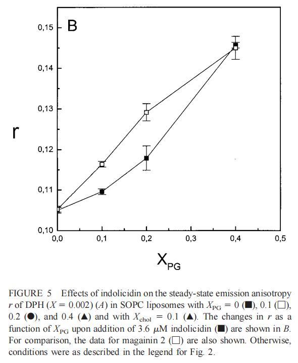雖然熒光光譜顯示,馬蓋寧2和吲哚西啶對(duì)脂質(zhì)動(dòng)力學(xué)的影響存在明顯差異,但也存在一些明顯的相似之處。因此,DPH各向異性r的增加表明,在存在酸性磷脂的情況下,這兩種肽都會(huì)導(dǎo)致酰基鏈順序的增加,這種影響的程度隨著XPG的增加而增加(圖3b和5b)。同樣,在膽固醇存在的情況下,兩種肽對(duì)芘熒光的有效猝滅也很明顯(圖2a和4a)。這可能與膽固醇的OH基團(tuán)和馬蓋寧的E19殘基之間的相互作用有關(guān)(Tytler等人,1995年),該肽在膜中具有跨膜取向。當(dāng)Xchol=0.1時(shí),r值的增加是由于吲哚西丁所致,而馬加寧則無影響。這表明,在膽固醇存在的情況下,吲哚肽可能采用跨雙層取向,其長軸垂直于雙層平面。