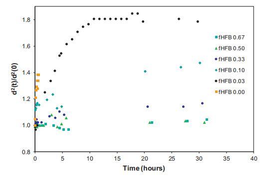 對于0.03<fHFBII<0.2的泡沫中氣泡尺寸的增加,觀察到在初始粗化數(shù)小時(shí)后,曲線趨于平穩(wěn)。在粗化過程中,小氣泡的收縮和總氣泡中較大氣泡的增長導(dǎo)致泡沫總表面積的凈減少。上述結(jié)果表明,氣泡穩(wěn)定性隨著表面積的逐漸減小而增加,這與朗繆爾槽上吸附系統(tǒng)在大變形壓縮/膨脹循環(huán)中觀察到的行為一致。