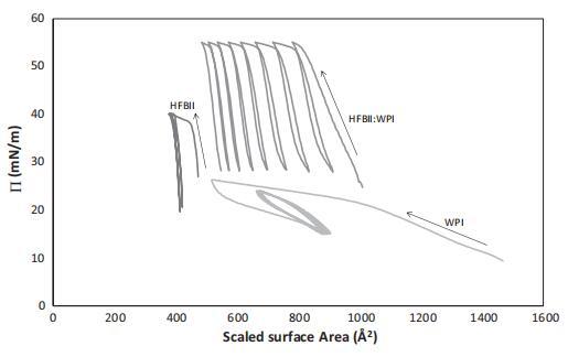 值得注意的是,對于純HFBII,П–A等溫線在連續(xù)的壓縮膨脹循環(huán)中不會發(fā)生變化,這再次表明HFBII不可撤銷地附著在界面上,幾乎沒有任何構(gòu)象變化。對于純WPI和1:1混合物,П–A等溫線略微向較小區(qū)域移動(dòng),這表明由于WPI分子的構(gòu)象變化、多層形成或如前所述,由于WPI的解吸,表面重排的可能性較小。
