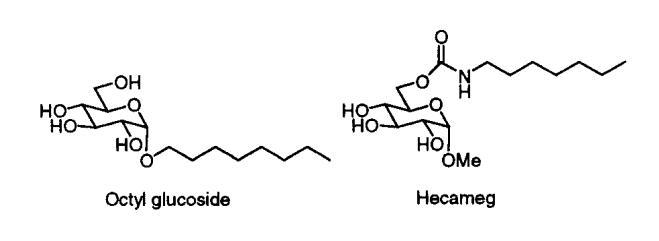 我們的第一個驚喜是發(fā)現(xiàn)A系列海藻糖雙子座不溶于水。例如,A-12、A-14和A-16(指鏈長的數(shù)字)在1毫升溫水中旋轉(zhuǎn)2毫克時會留下沉淀物。即使在70°C的溫度下,A-10也會在這種處理過程中形成渾濁的懸浮液。A-8在室溫下的可溶濃度僅為1-2 mM(根據(jù)動態(tài)光散射,在該濃度下,會形成膠束大小的聚集體)。天真地說,人們可能會認為a-8的溶解度大得多,因為該分子由六個羥基和兩個酰胺組成。盡管相關的6-氨基-6-脫氧己糖衍生物需要加熱才能溶解,25許多烷基化單糖(例如,辛基葡萄糖苷和甲基6-O-(N-庚基羰基)-R-D-吡喃葡萄糖苷或下面的“Hecameg”)是水溶性的。然而,A-8并沒有類似的天賦。這里的教訓是,用一句老生常談的話來說,我們的雙子座比其各個部分的總和要多(或少)。不管老生常談與否,雙子座的獨特屬性都取決于它。