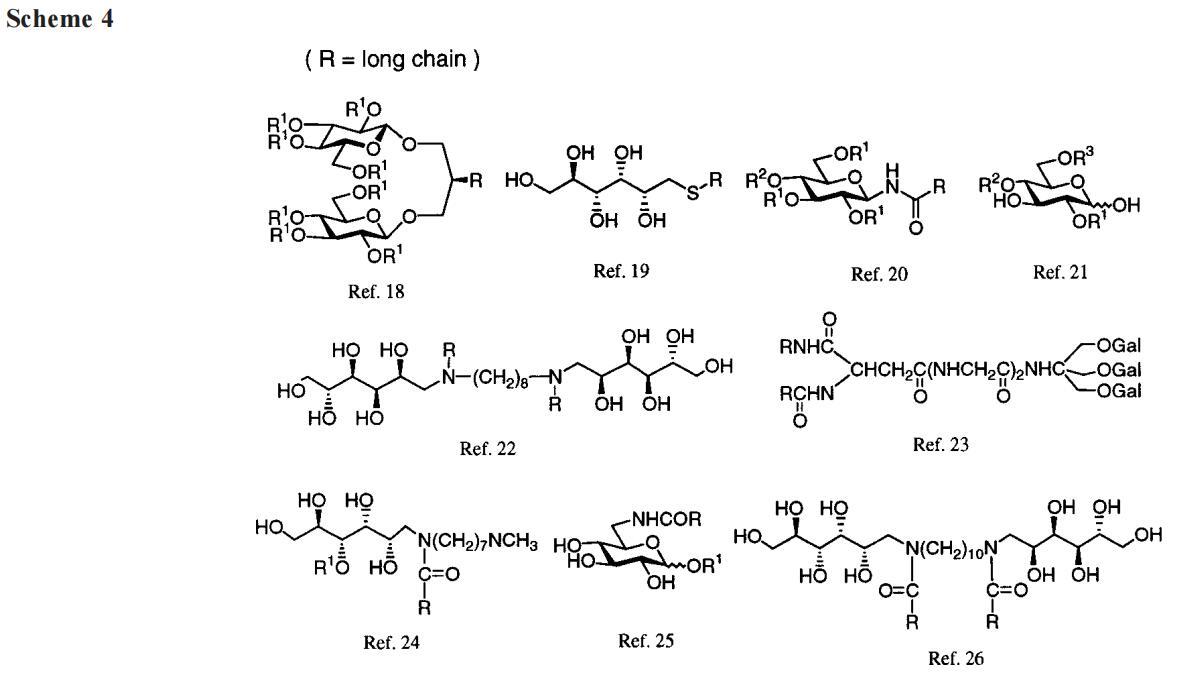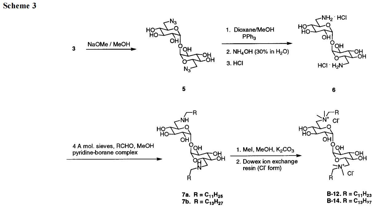 接下來,我們提出了在海藻糖衍生物上放置陽離子基團以改善其水溶性的想法。必須承認,我們對更易管理的水溶性化合物的前景感到一定程度的高興。B系列就這樣出現(xiàn)了。然而,我們立即面臨新的問題。雖然B-12和B-14是作為純化合物獲得的,但B-16和B-18并非如此。后兩種Gemini的產(chǎn)率較低,提供了令人滿意的光譜數(shù)據(jù),但它們的元素分析偏離了理論1-2%(這使我們懷疑存在無機雜質(zhì))。無論如何,由于B-16和B-18不符合我們的高純度標準,我們在注意力上輕視了它們,而偏愛它們的矮表親。