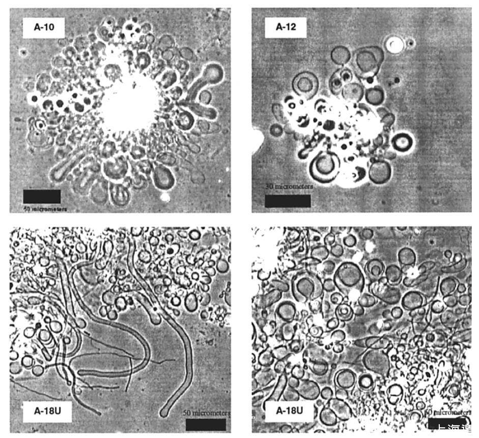 圖2。A-10(左上)、A-12(右上)和A-18U(下)在23°C下水合3-4小時后形成的囊泡和管狀結(jié)構(gòu)的相襯顯微照片。在45°C下培養(yǎng)的A-14和A-16樣品中觀察到類似結(jié)構(gòu)。