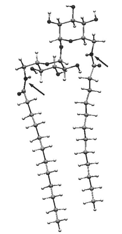 計算首先將海藻糖插入宏模型程序42,并對結(jié)構(gòu)進行琥珀色能量最小化。從使用琥珀色*力場的25000個構(gòu)象搜索中,我們選擇了能量最低的構(gòu)象,該構(gòu)象恰好與報告的X射線結(jié)構(gòu)重疊。43,44接下來,該結(jié)構(gòu)中的6-和6′-羥基被乙酰氨基取代。在模擬的水環(huán)境中,用AMBER*再次進行了25000次構(gòu)象搜索。然后乙酰基被十二烷基取代,然后對生成的a-12雙子座進行了另一次搜索。結(jié)果表明,整個構(gòu)象由酰胺羰基和相鄰葡萄糖環(huán)的2-羥基之間的兩個分子內(nèi)氫鍵控制。氫鍵導致兩條全反式鏈彼此擺動約95°。A-12的固態(tài)紅外光譜證實了這種相互作用,該光譜顯示1646 cm-1處有羰基帶,而Hecameg的羰基帶為1700 cm-1,單體葡萄糖類似物的羰基帶為1698 cm-1。25由于這種構(gòu)象會不切實際地排除分子內(nèi)疏水締合,而且在任何情況下,羰基氫鍵位點的溶劑可能會淹沒在水中,我們故意不允許-CdO氫鍵,并重新計算。通過這種方式,我們得到了圖6。可以看到,一條鏈上大約有八個碳與其伙伴鏈的碳并排排列。N/N距離僅為7.4?,整體分子形狀為“管狀”。用另一種方式說,糖的頭基延伸的距離不比兩條鏈的寬度大多少,就像人們預期的一種易于堆積成雙層的化合物那樣。45因此,正如前面從實驗數(shù)據(jù)得出的結(jié)論,海藻糖更像是一個統(tǒng)一的頭基,而不是一個可以有效隔離鏈的長間隔基。