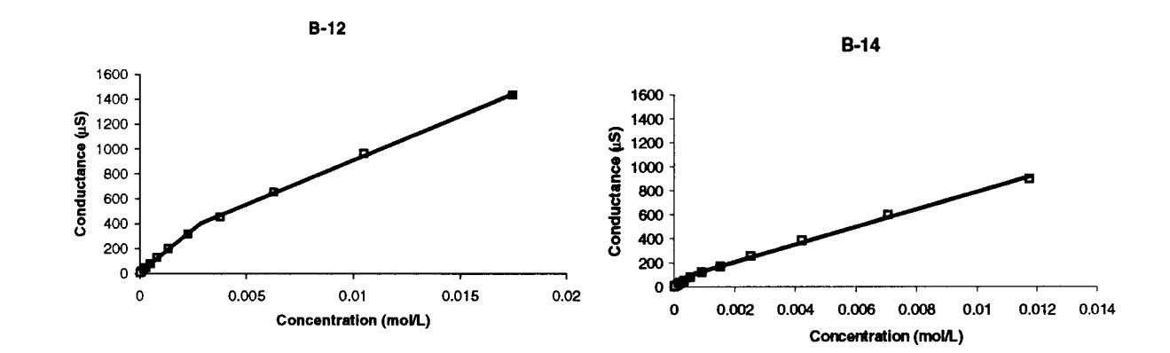 圖5。圖中給出了B-12和B-14臨界膠束濃度,該濃度由電導-濃度曲線中的斷裂點確定。每個點代表23°C下的單個電極讀數(shù)。