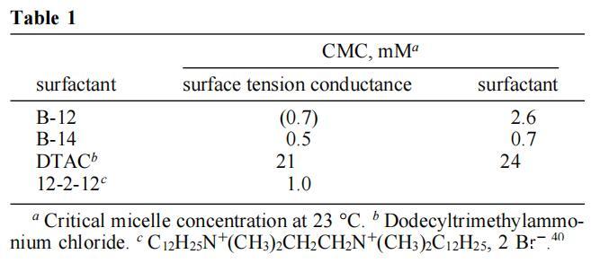 B-12和B-14確實是水溶性化合物,在臨界膠束濃度(CMC)以上形成膠束,動態(tài)光散射顯示顆粒大小小于5nm。CMC值是通過表面張力-濃度曲線(圖4)和電導率-濃度曲線(圖5)中的斷裂來確定的。38表1給出了結(jié)果數(shù)據(jù)(以及兩種常規(guī)表面活性劑的數(shù)據(jù),用于比較)。如圖所示,B-12的CMC值通過張力測量法和電導測量法(這兩種方法都是可重復的)得出的結(jié)果不一致。這種差異至少部分可以追溯到B-12表面張力的時間依賴性。因此,在10分鐘的過程中,B-12水溶液的表面壓力增加了10 mN/m,之后趨于穩(wěn)定。這種動態(tài)表面張力過程(之前已經(jīng)用雙子座表面活性劑觀察到)13,15,39可能與雙子座表面活性劑在空氣/水界面組織方面的困難有關。為了解決這個問題,圖4中的B-12溶液在表面張力測量之前老化20分鐘,從而減少了系統(tǒng)尚未平衡的可能性。盡管采取了這種預防措施,但我們無法確定依賴時間的界面重組是否不會影響B(tài)-12圖,并導致基于張量和電導的數(shù)據(jù)之間的差異。當然,后者來源于不受界面事件影響的大塊特性,因此更可靠。有趣的是,B-14沒有表現(xiàn)出隨時間變化的表面張力,兩種方法確定的CMC值是合理一致的。也許更長的鏈既增強了對空氣/水界面的親和力,也增強了從溶液中吸收界面的動力學。