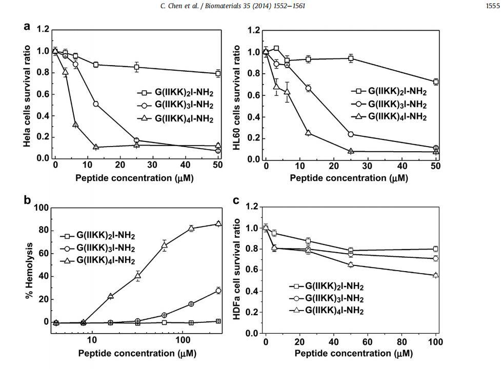 開發(fā)對(duì)宿主細(xì)胞具有良好生物相容性但對(duì)癌細(xì)胞具有高效力的功能性生物材料和藥物是一項(xiàng)具有挑戰(zhàn)性的工作。通過利用天然抗菌肽和a-螺旋蛋白的優(yōu)勢特性,我們?cè)O(shè)計(jì)了一類新的短a-螺旋肽G(IIKK)nI-NH2(n細(xì)胞)。我們表明,含有?n1e4的肽具有不同的效力和對(duì)癌癥?3和4的高選擇性,能夠有效殺死癌細(xì)胞,同時(shí)在其工作濃度下對(duì)宿主細(xì)胞保持良性,通過類似于殺菌效果的機(jī)械過程。細(xì)胞的高選擇性可能源于它們優(yōu)先與帶有負(fù)電荷和高流動(dòng)性的細(xì)胞外膜結(jié)合。除了快速透膜能力外,這些肽還可以通過線粒體途徑和死亡受體途徑誘導(dǎo)癌細(xì)胞的程序性細(xì)胞死亡,而不會(huì)誘導(dǎo)非特異性免疫原性反應(yīng)。重要的是,這些肽還可以在小鼠異種移植模型中抑制腫瘤生長,而不會(huì)引起副作用。雖然這項(xiàng)研究揭示了這些肽作為強(qiáng)效藥物和其他醫(yī)療保健應(yīng)用的臨床潛力,但它也指出了基礎(chǔ)材料研究在高選擇性肽功能材料未來發(fā)展中的重要性。