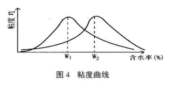 含水量高則流動(dòng)性好(即每個(gè)顆粒表層水膜厚),但凝聚性差,坯體易變形。因此,對(duì)每一企業(yè)來講,在原料處理、擠泥機(jī)等條件固定的前提下,摸索一個(gè)合適的成型含水率,既利于擠泥機(jī)成型,又利于磚坯強(qiáng)度。根據(jù)我們對(duì)幾十種黏土的試驗(yàn)數(shù)據(jù),每種黏土都有一個(gè)最佳含水率,在這種含水率的情況下,黏土的粘性(稠度)最好。典型的粘度曲線(見圖4):
