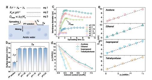 含有聚乙烯亞胺(PEI)和聚苯乙烯磺酸鈉(PSSNa)的水溶液滴在水表面自發(fā)鋪展成膜(圖1,圖2)。一般而言,水溶液液滴與水接觸時首先發(fā)生向水中的擴散與混溶,而非鋪展。為了抑制水-水?dāng)U散與混溶,作者設(shè)計了PEI-PSSNa和混合溶液,其pH為堿性。當(dāng)該溶液液滴與酸性水接觸時,水中含有的大量質(zhì)子促使PEI高分子鏈上的氨基質(zhì)子化,隨后帶正電的PEI與PSSNa在水-水界面上發(fā)生靜電絡(luò)合,有效抑制了溶液向水中的擴散與混溶。與此同時,PEI-PSSNa的表面張力比水低,液滴因此在水表面可自發(fā)鋪展,而非混合。二者協(xié)同,促使了水溶液液滴在水面進行自發(fā)鋪展。