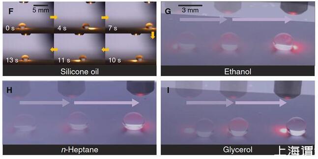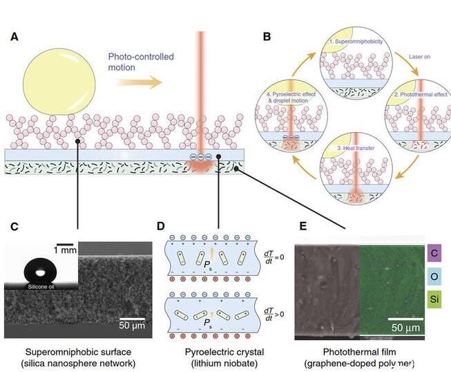 光電微流控平臺(tái)的設(shè)計(jì):微流控平臺(tái)包括底層的光熱薄膜(石墨烯摻雜的PDMS),中間層的熱釋電晶體(LiNbO3)和上層的超疏液涂層(SiO2納米空心球分形網(wǎng)絡(luò))(圖1)。光束可以穿過(guò)上層透明的超疏液涂層和熱釋電晶體照射到底面的光熱薄膜,光熱薄膜將光能轉(zhuǎn)換成熱能使自身溫度升高,從而加熱上方的熱釋電晶體在光束照射處產(chǎn)生表面電荷,當(dāng)電荷引起的介電泳力足以克服液滴在超疏液涂層上的粘附力,液滴則被吸引至光束下方。超疏液涂層不僅為液滴移動(dòng)創(chuàng)造了極低的阻力,而且避免了液體殘留,使得無(wú)損液滴操控成為可能,可以對(duì)包括硅油、乙醇、正庚烷和甘油在內(nèi)的30多種液體(表面張力18.9-98.0mN/m)進(jìn)行無(wú)損光控操作。