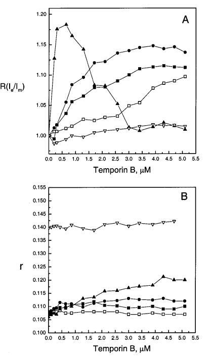 圖3:通過芘標(biāo)記的磷脂PPDPC(X)0.01)的熒光和DPH(X)0.002的穩(wěn)態(tài)發(fā)射各向異性r評(píng)估顳葉素B對(duì)LUV中脂質(zhì)動(dòng)力學(xué)的影響,顯示為具有XPOPG)0(0)、0.10(9)、0.20(B)和0.40(2)的SOPC脂質(zhì)體中歸一化準(zhǔn)分子與單體比率r(Ie/Im)(圖A)和各向異性r(圖B)的變化,Xchol)0.10(3)。每個(gè)數(shù)據(jù)點(diǎn)代表三次測(cè)量的平均值。標(biāo)準(zhǔn)偏差小于0.02(面板A)和0.004(面板B),為清楚起見,未顯示。否則情況如圖2圖例所示。