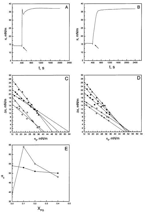 圖1:將時(shí)間蛋白B和L插入脂質(zhì)單層。在初始表面壓力(π0)分別為14.6和15.5 mN/m的情況下,在SOPC/POPG(XPOPG)0.2)單層下方注射顳蛋白B(面板a)或顳蛋白L(面板B)后,表面壓力隨時(shí)間的增加而增加。肽(0.3μM最終濃度)的添加用箭頭標(biāo)記。表面壓力增量(?π)將0.3μM顳蛋白B(圖C)或顳蛋白L(圖D)添加到亞相中導(dǎo)致的脂質(zhì)單分子膜的數(shù)量表示為初始表面壓力(π0)的函數(shù)。SOPC中POPG(XPOPG)的含量分別為0(0)、0.10(9)、0.20(b)和0.40(2)。還顯示了將肽插入具有Xchol)0.1(3)的SOPC膜中。圖E顯示了πc的值,分別作為滲透時(shí)間蛋白B(O)和時(shí)間蛋白L(B)時(shí)XPOPG的函數(shù)。每個(gè)數(shù)據(jù)點(diǎn)代表三次測(cè)量的平均值。標(biāo)準(zhǔn)偏差在0.1和0.8 mN/m之間變化,為清晰起見,未顯示。