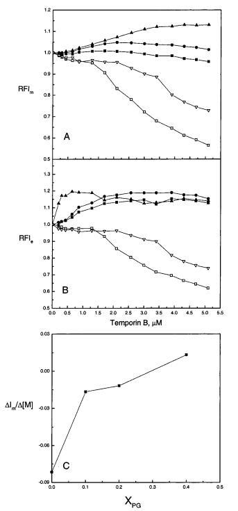 顳蛋白對(duì)雙層脂質(zhì)動(dòng)力學(xué)的影響。隨后通過記錄摻入LUVs的芘標(biāo)記熒光磷脂類似物PPDPC(X)0.01)的發(fā)射光譜來研究肽與脂質(zhì)體結(jié)合的后果。對(duì)于含有脂質(zhì)類似物(如PPDPC)的單個(gè)芘部分,穩(wěn)態(tài)Ie/Im值反映了膜中熒光團(tuán)的橫向遷移率和局部濃度(18,19)。然而,我們之前的研究比較了兩種其他抗菌肽(馬蓋寧2和吲哚肽)對(duì)膜脂質(zhì)動(dòng)力學(xué)的影響,發(fā)現(xiàn)這些肽也影響芘標(biāo)記脂質(zhì)的量子產(chǎn)率(15)。對(duì)于SOPC LUV,添加temporin B分別導(dǎo)致芘單體和準(zhǔn)分子發(fā)射Im和Ie的顯著減少,最大減少約40%(圖2,面板a和B)。芘熒光帶的猝滅是雙相的,當(dāng)時(shí)間蛋白B與脂質(zhì)的摩爾比約為1:12時(shí),量子產(chǎn)率顯著降低(圖2,面板a和B)。在膽固醇(Xchol)0.10)存在的情況下,temporin B對(duì)芘單體和準(zhǔn)分子熒光的猝滅也很明顯,盡管發(fā)射的減少量小于在SOPC LUV中觀察到的減少量(圖2,面板A和B)。然而,當(dāng)酸性磷脂POPG存在于XPOPG)0.10時(shí),Im中只有微不足道的變化是明顯的,當(dāng)XPOPG從0.20增加到0.40時(shí),時(shí)間蛋白B導(dǎo)致Im以漸進(jìn)的方式增加,Im的初始增量在大約2/1的POPG/時(shí)間蛋白B化學(xué)計(jì)量比下趨于穩(wěn)定。在達(dá)到飽和響應(yīng)之前,Im中線性增量的斜率隨著XPOPG而增加(圖2,面板C)。在POPG存在的情況下,顳蛋白B也增加了Ie。在XPOPG)0.40時(shí),Ie的值逐漸增加,直到顳蛋白B:脂質(zhì)摩爾比為≈1:15,對(duì)應(yīng)于≈1/6,而當(dāng)超過該化學(xué)計(jì)量比時(shí),Ie降低。圖3,面板A中顯示了由于顳蛋白B引起的Ie/Im的變化。具體而言,SOPC LUV的Ie/Im增加了1.1倍,而在膽固醇(Xchol)0.10的存在下,觀察到Ie/Im的微小變化,面板A)。將XPOPG從0.10增加到0.20會(huì)逐漸增強(qiáng)Ie/Im的增量。有趣的是,在XPOPG)0.40時(shí),當(dāng)時(shí)間蛋白B:脂質(zhì)摩爾比為≈1:30.然而,在這一肽:脂比之上,顳葉素B導(dǎo)致Ie/Im降低,而在這一肽:脂比之上,Ie/Im的變化不顯著≈1:6.
