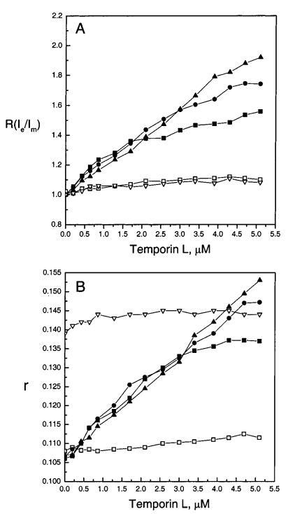 圖5:通過芘標記的磷脂PPDPC(X)0.01)的熒光和DPH(X)0.002的穩(wěn)態(tài)發(fā)射各向異性r評估顳葉素L對LUV中脂質(zhì)動力學的影響,顯示為含XPOPG)0(0)、0.10(9)、0.20(B)和0.40(2)的SOPC脂質(zhì)體中歸一化準分子與單體比率r(Ie/Im)(圖A)和各向異性r(圖B)的變化,Xchol)0.10(3)。每個數(shù)據(jù)點代表三次測量的平均值。標準偏差小于0.02(面板A)和0.004(面板B),為清楚起見,未顯示。否則情況如圖2圖例所示。