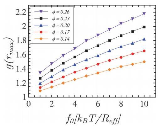 圖7顯示了面積分?jǐn)?shù)的五個(gè)代表值的g(rmax)作為f0的函數(shù),單位為kBT/Reff。