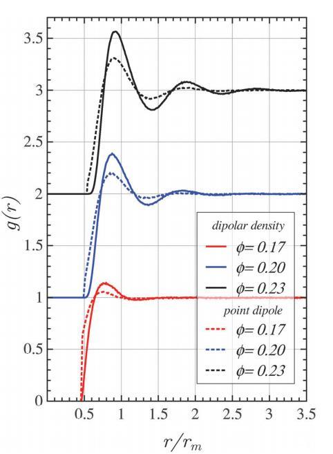 在第一個(gè)峰值位置和g(r)開始偏離零的小區(qū)域觀察到輕微差異。當(dāng)系統(tǒng)更加結(jié)構(gòu)化時(shí),協(xié)議會(huì)得到改善。特別是,對(duì)于弱相互作用域,差異開始明顯。這些偏差是由于點(diǎn)偶極力在接觸時(shí)趨于有限值,而在偶極密度情況下,它會(huì)發(fā)散。因此,硬盤相互作用與點(diǎn)偶極子模型有關(guān)。