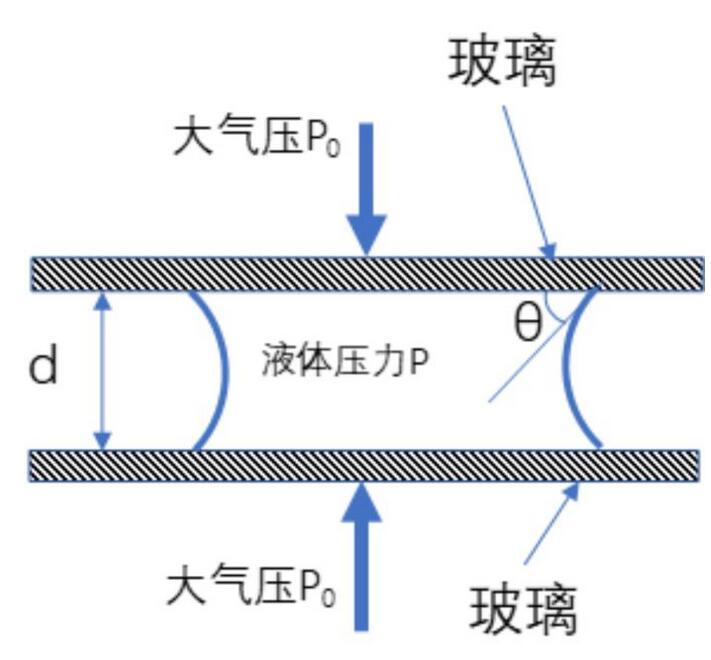 我們可以想象,當(dāng)兩片玻璃間隙非常小的時(shí)候,這個(gè)凹液面的曲率就會(huì)非常大,在這個(gè)時(shí)候,液體壓力與大氣壓的差就會(huì)很大,因此把玻璃擠壓在一起的力也就很大。我們可以用楊-拉普拉斯公式來估算一下。