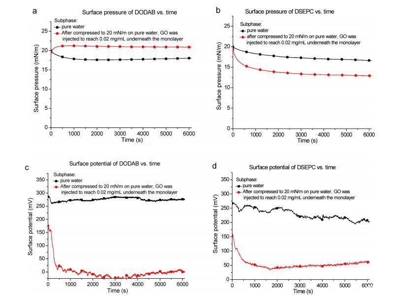 圖2:(a)DODAB和(b)DSEPC單層的表面壓力與經(jīng)過(guò)時(shí)間。(c)DODAB和(d)DSEPC單層的表面電位與經(jīng)過(guò)時(shí)間的關(guān)系。黑色曲線(xiàn):在純水亞相上將單層壓縮至20 mN/m的表面壓力。紅色曲線(xiàn):將單層壓縮至20 mN/m后,小心地將600μL 1 mg/mL GO分散液緩慢注入單層下方的水亞相中,使GO達(dá)到0.02 mg/mL。